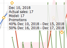 If you import information on promotions, the Plot indicates the affected periods with orange diamonds. The pop-up hint over such a period additionally shows a list of promotions the period includes.