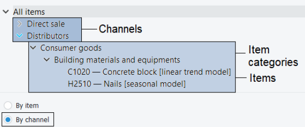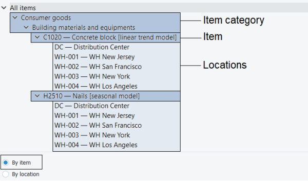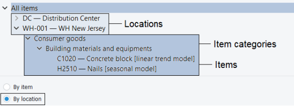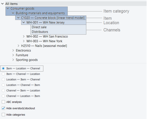 Depending on the imported and configured data, the Tree View shows imported items, locations, channels, and item/location categories. It is used to: