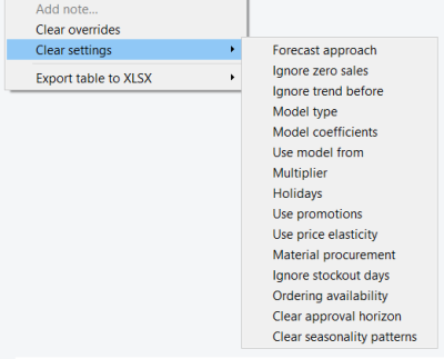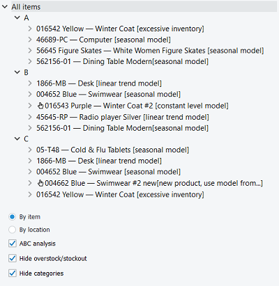 The Tree view is tightly linked to the Forecasting tab settings. Each option of the tab (except default option) has its own icon that is immediately prefixed to the currently selected tree node. The description of this notation is the following: