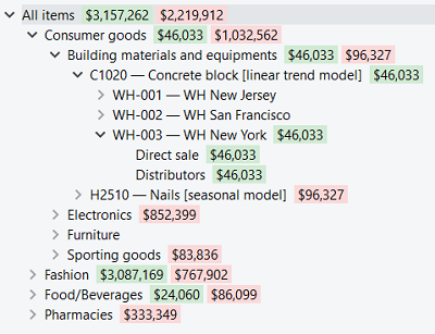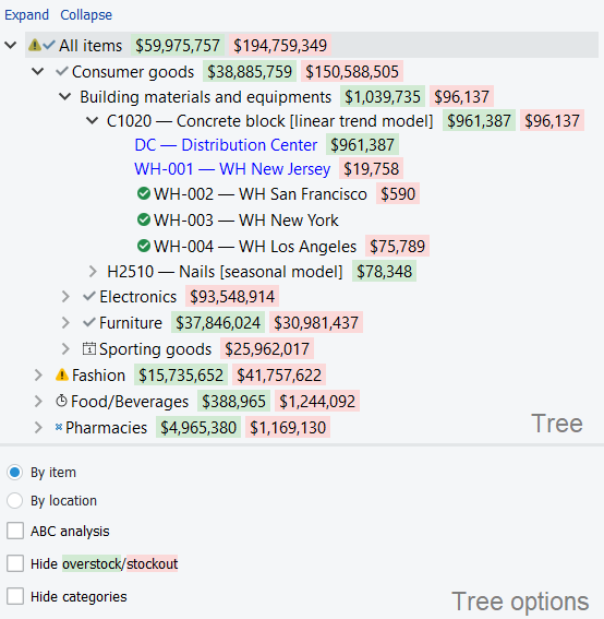 Color-coded numbers in the Tree view show projected stockouts or overstocks in monetary terms. In other words, this feature indicates how much money the company is losing.