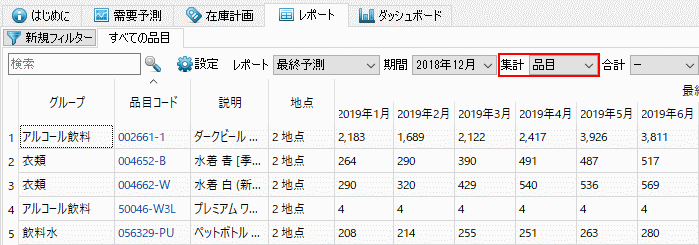 このレポートは、最も詳細なツリー構造の最下位である、計画品目の情報をデフォルトで表示します。地点を利用している場合、計画品目は品目 - 地点の組み合わせとなります。これら計画品目を上位の品目レベルで参照する場合、集計コントロールの品目オプションを選択します(下記の図を参照)。