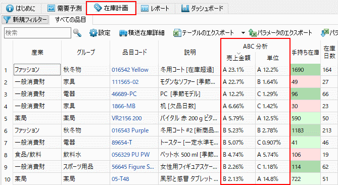 ツリー ビューに表示されてるABC分析 オプションの結果は、在庫計画タブをクリックすると、在庫レポート内のABC分析列にも表示されます(下記の図を参照)。