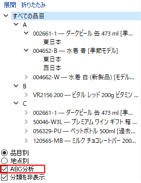 この場合、ABC分析チェックボックスの下にある 分類を非表示 オプションが、非常に便利です。すべての分類や小分類を非表示にし、計画品目とABC 分類のみを表示します。