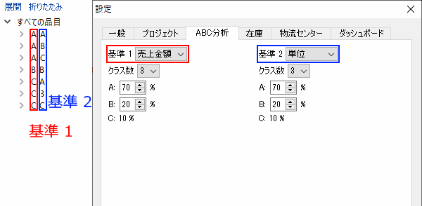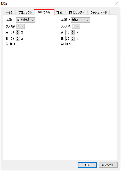 ABC分析の次元や、各次元の基準を設定するには、メニューよりファイル > 設定 > ABC分析タブを選択します(下記の図を参照)。