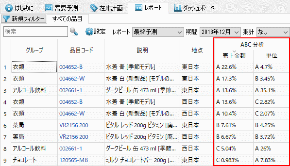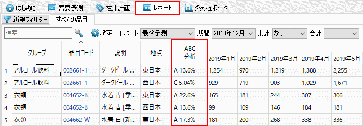 ABC分析の結果は、レポート のタブのテーブル内のABC分析列に表示されます(下記の図を参照)。