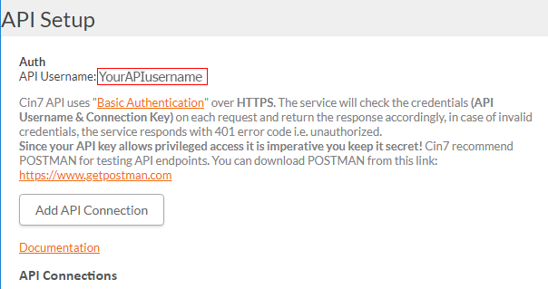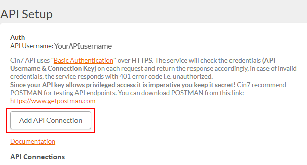 API Keyを取得するには、Cin7を使いAPI接続の作成が必要です。次の手順に従い、作成します。: