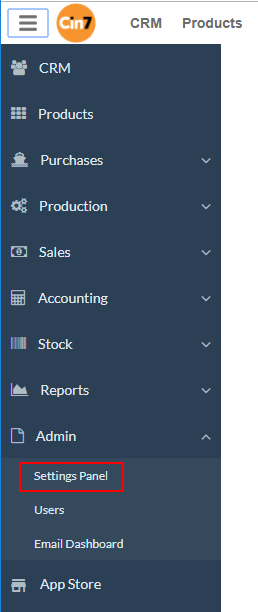 2. メニューより Admin > Settings Panel を選択します(下記の図を参照)。