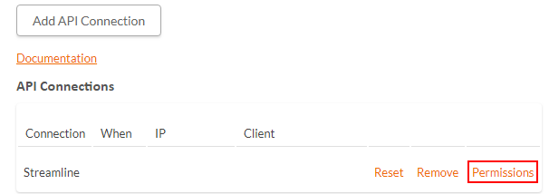 2. API接続一覧から最新の接続を見つけ、対応するPermissionsリンクをクリックします(下記の図を参照)。