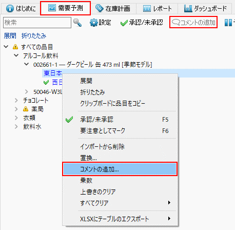 3. 需要予測ツールバーのコメントの追加ボタンをクリック、または右クリックメニューのコメントの追加…を選択します。