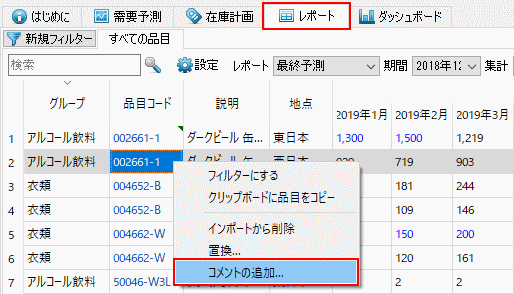 レポートや在庫計画タブでも、コメントの追加や編集や削除ができます。次の手順に従い、コメントを追加します。: