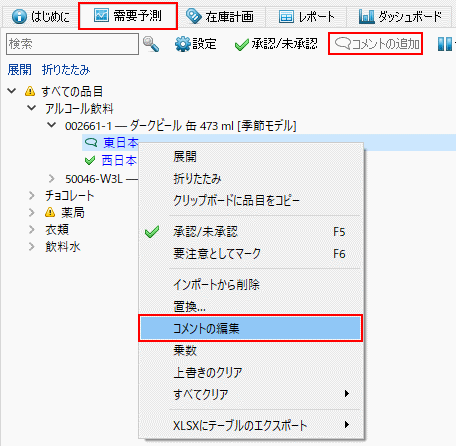 変更の追加時または予測の承認時、ツリー ビューに表示されるコメントを品目に追加できます。ツリー ビューのSKUまたは計画品目にコメントを追加できます。このセクションでは、ツリー ビューノードを対象としたコメントの追加や編集や削除の方法を説明します。
