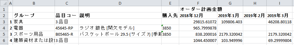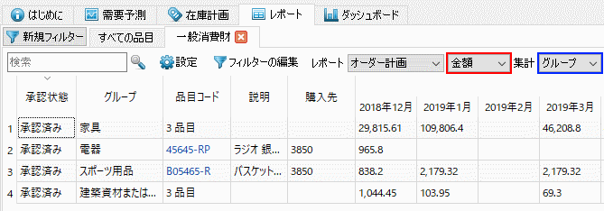 3. ここで、レポートをグループ列で集計します。その後、表示単位を金額に変更します(下記の図を参照)。