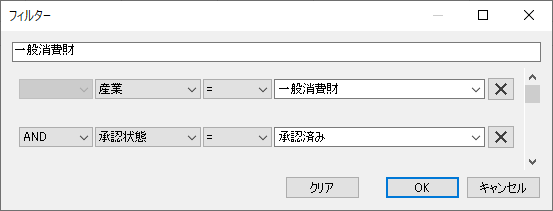 2. 必要に応じて、ヘッダセクションにある列を選択してフィルター条件を作成できます。フィルターは、設定された基準を満たす品目だけを表示します。私たちの例では、品目分類の1つである、産業から一般消費財を選択し、さらに承認状態から承認済みを選択します。フィルターを作成するため、新規フィルターボタンをクリック後、下記の図にあるフィルターダイアログに表示されている設定をします。