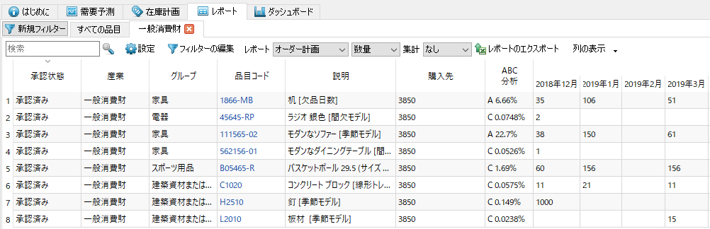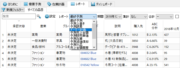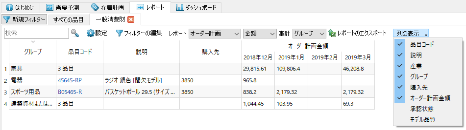 GMDH Streamlineは、レポートのカスタマイズ機能は非常に強力です。需要予測や在庫計画の様々な側面に気づく多くのレポートを提供します。GMDH Streamlineのレポートは、過去未来の2つの観点から情報を表示します。またすべてのレポートは高度なカスタマイズができます。設定した条件を満たす品目を表示させるフィルターを利用し、カスタマイズレポートを作成できます。一方で、レポート内で見たい列だけを設定することもできます。さらには、レポートは行や列にて集計もできます。