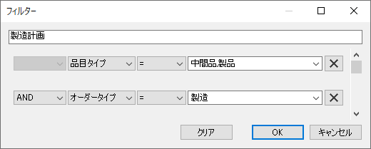 新規フィルターボタンをクリックして、製造計画を表示するレポートを作成します。フィルターダイアログが開きます。このダイアログを下記に表示されているように設定します。