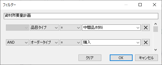資材所要量計画を表示するレポートを作成するため、新規フィルターボタンをクリックします。ここで、フィルターダイアログが開きます。このダイアログに下記の設定をします。