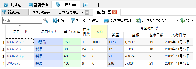 説明済みですが、GMDH Streamlineは、在庫計画タブ、内部倉庫最適化タブ、物流センタータブで在庫レポートを表示します。このセクションでは、組み込みのデモデータのMaterial Requirements Planningを利用し、在庫計画タブにカスタマイズされた在庫レポートを作成します。他のタブでも、同様の方法で作成できます。