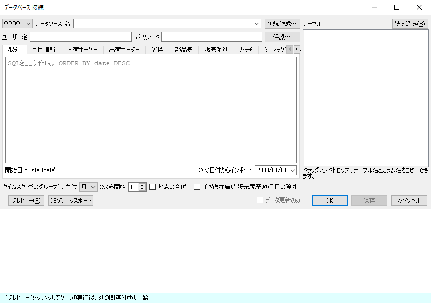 Remove this page from your book データベース 接続を利用して、需要計画、売上金額予測、在庫最適化などに必要なデータタイプをすべてインポートできます。追加軸として、地点またはチャネルをインポートできます。地点を追加した場合、地点や場所別の需要予測や在庫計画の立案が可能になります。チャネルを追加した場合、チャネル別や顧客別に需要予測や在庫計画の立案が可能になります。