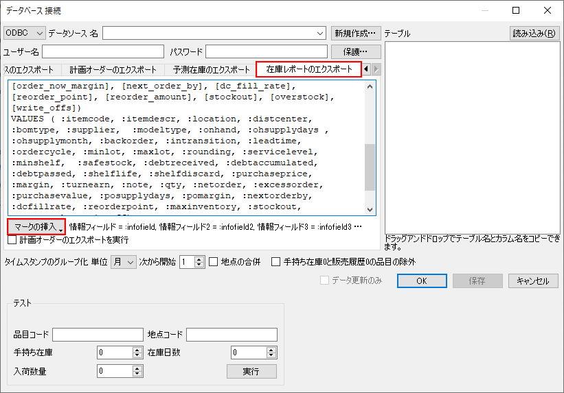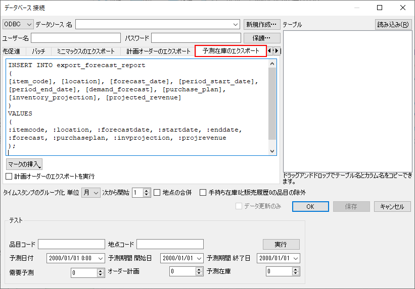 次に、予測在庫のエクスポート タブにて、SQL クエリを追加します(下記の図を参照)。