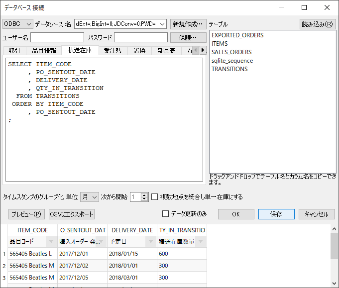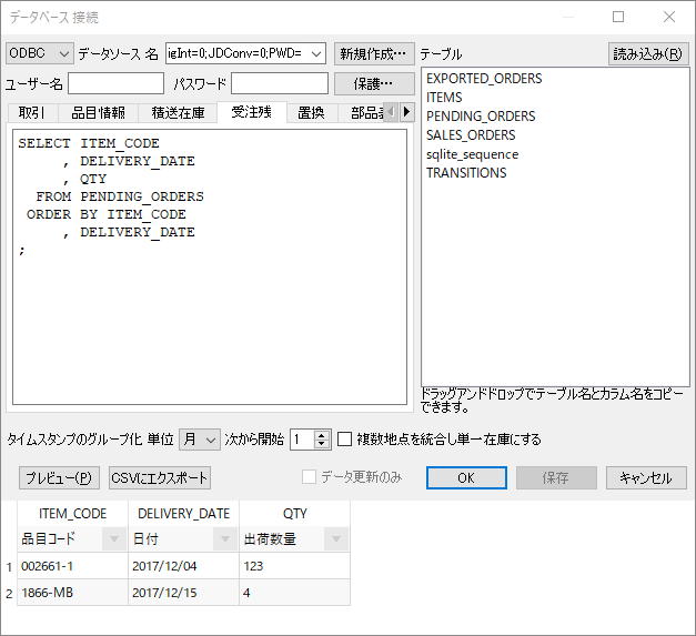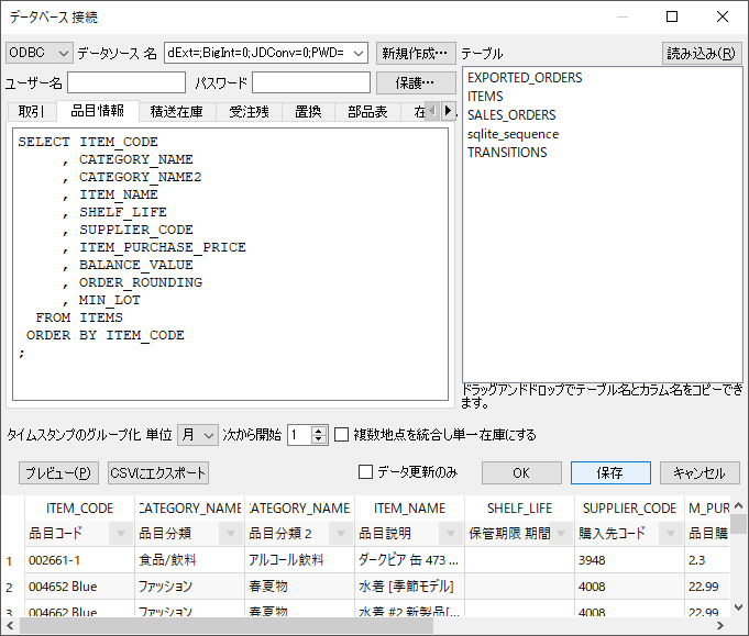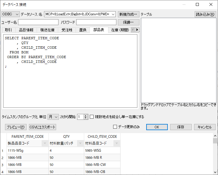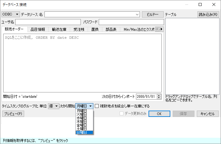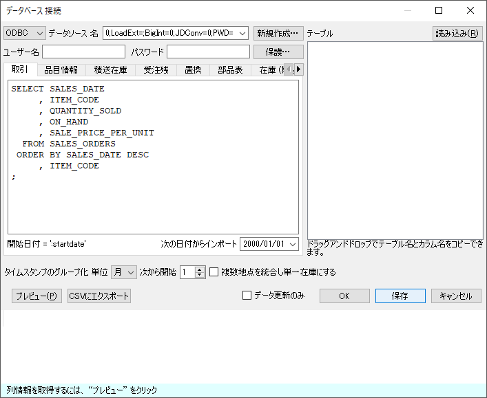 この特殊な場合では、 地点状況(最終 手持ち在庫出荷数量入荷数量入荷日付)を除く、すべてのフィールドを 品目情報クエリを使ってインポートできます。地点状況の情報は、他のSQL クエリを経由して取得します。例えば、最終 手持ち在庫出荷数量取引クエリを利用し、入荷数量入荷日付入荷オーダークエリを利用します。