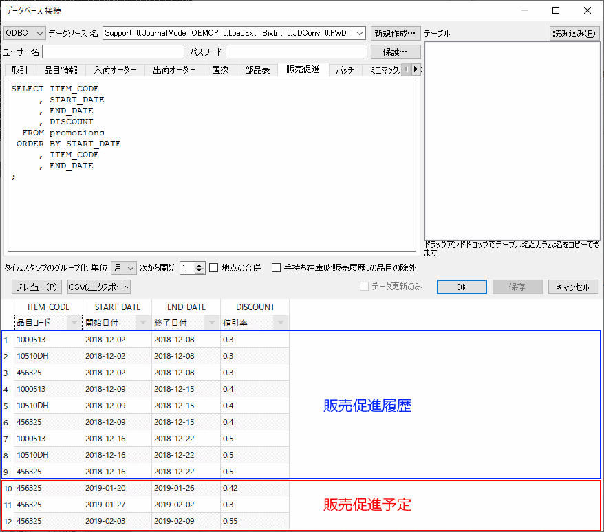 このSQL クエリは、与えられた販売促進の値引きから、GMDH Streamlineが予測モデルを自動で調整できる情報をインポートするために利用します。下記の図は、SQL クエリの例とデータベースからの結果を紹介します。