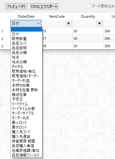 非推奨データ: 入荷数量、入荷日付、出荷数量。