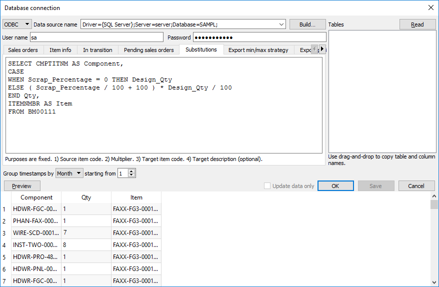 GMDH Streamlineは、データインポート中の置換ができます。キット品目を分解する必要があり、構成部品だけを対象とした需要予測と資材調達計画が必要な場合、置換を利用します。キット品目は、置換ルールに従い構成部品に置換されます。置換ルールは次のように設定します。:
