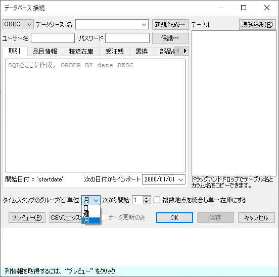 インポートプログラムは、 タイムスタンプのグループ化 オプションを利用して、(日、週、月)期間のタイムスタンプを自動的に集計します。需要予測や購入計画や他のレポートを月単位で確認する場合、月単位でデータをグループ化します。