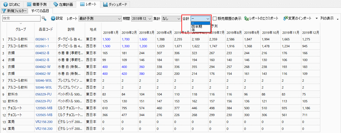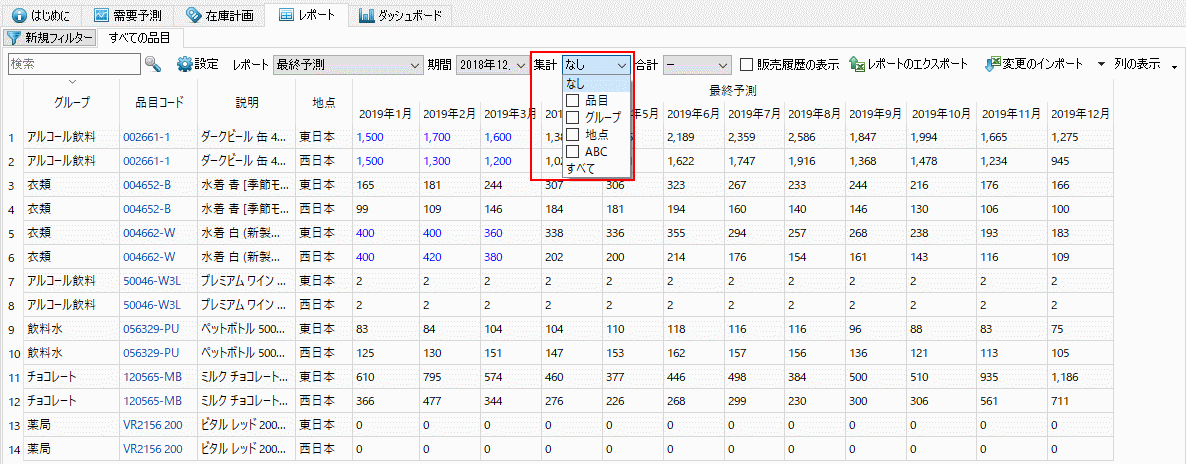 エクスポート前に、品目別、 地点別、チャネル別、ABC分析別、品目分類別、または集計コントロールに表示されるオプション別に一括集計できます(下記の図を参照)。