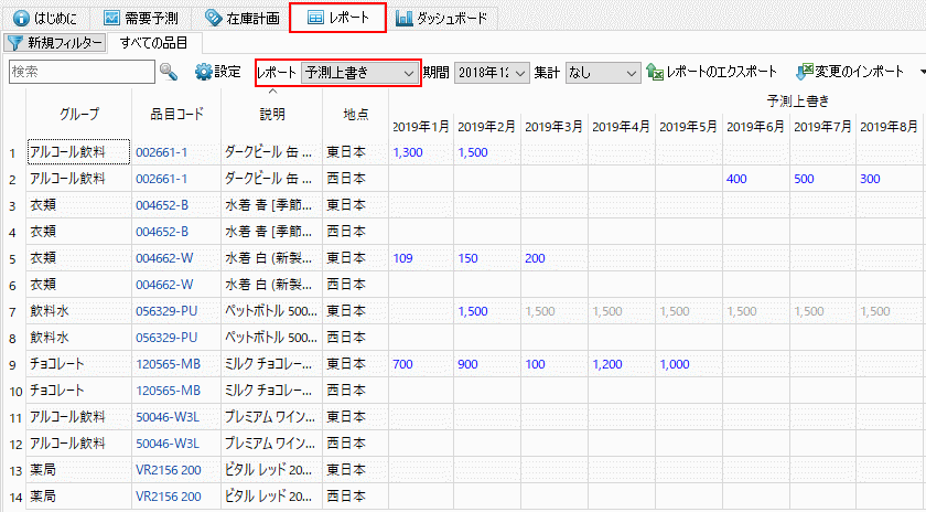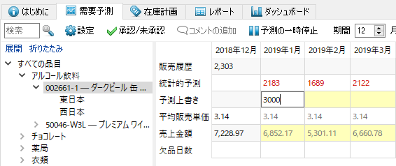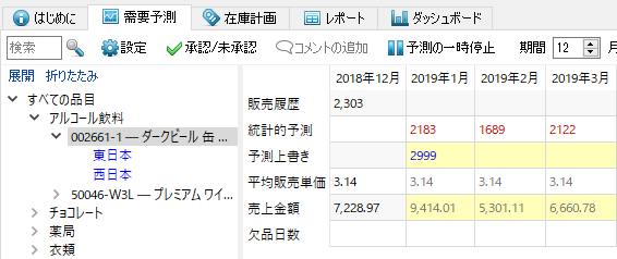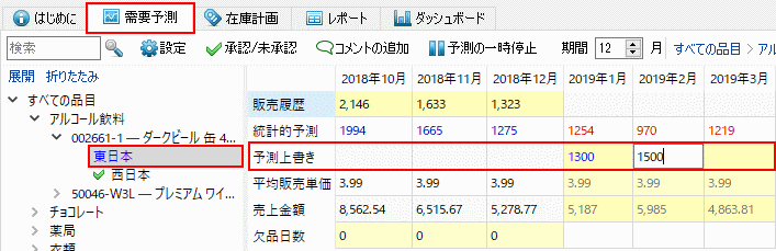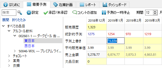 ツリー ビューのすべての階層で、需要予測調整ができます。