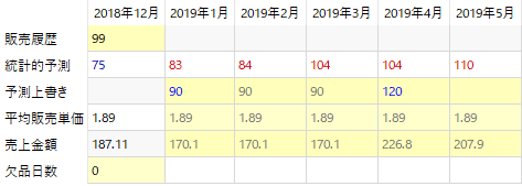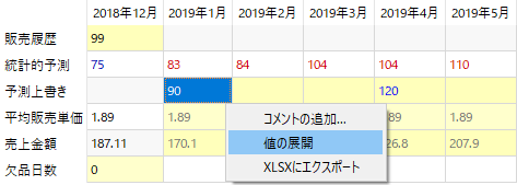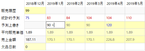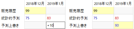 2019年1月の統計的予測は、83です。予測調整行にて +10 を入力し、その値を増やします。Enter入力後、最終的な結果は、93になります3)