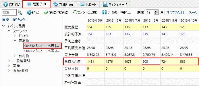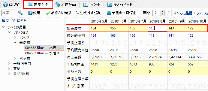 履歴データは、ツリー ビューの最下層で変更できます。元の数値に戻す場合、修正値を空欄にします。変更後の値はすべて青文字で表示されます。予測ボタンをクリックしからプロジェクトの再予測して、修正値を予測に適用します。