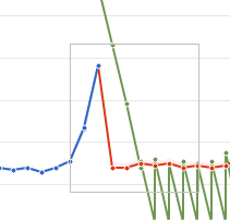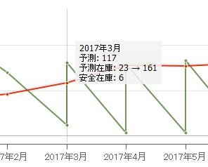 積送在庫の到着に加えて、オーダーサイクルに基づき発行されたオーダーの到着予定もプロットに表示されます。予測期間内で複数の補充シミュレーションを実行し、補充オーダーを自動作成します。例えば、2017年3月の最終日に23を161に増やす資材調達がある場合、下のように表示されます5)。