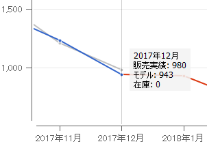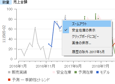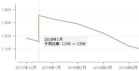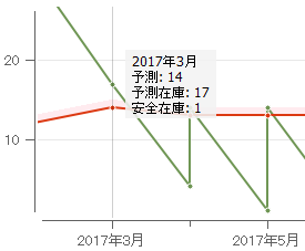 販売履歴と在庫情報をインポートした場合、予測在庫水準が緑の線で表示されます。ポップアップは、期間の終了時点の予測在庫も表示します。予測在庫水準例は、2017年3月の終了時点になります。