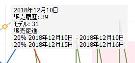 販売促進に関する情報をインポートした場合、プロットは、販売促進の影響があった期間にオレンジの菱形を付けます。このような期間にマウスを重ねたときに表示されるポップアップヒントでは、その期間を含めた販売促進一覧を表示します。