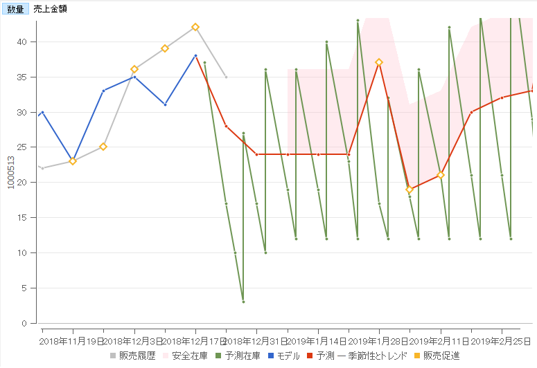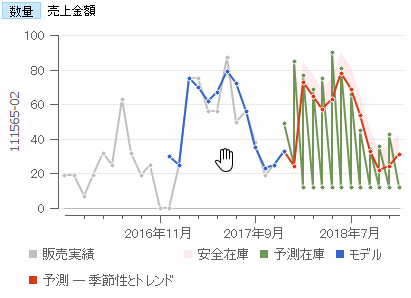 販売履歴をインポートし、在庫情報をインポートしない場合、プロットは販売履歴とモデルと予測と安全在庫区間を表示します。プロットの点にマウスを重ねると、垂線が表示され、垂線が交わる期間と数値をすべて表示します。