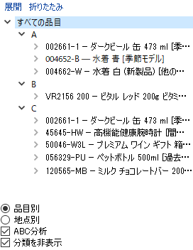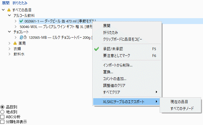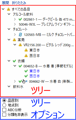 インポートしたデータと設定データに依存しますが、ツリー ビューは、インポートした品目、地点、チャネル、品目分類、地点分類を表示します。下記で利用できます。