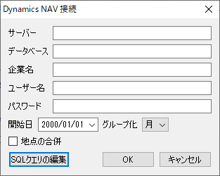 1. メニューのファイル > 新規 > Dynamics NAV 接続を選択します。Dynamics NAV 接続ダイアログが開きます(下記の図を参照)。