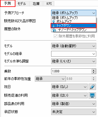青色の下矢印は、選択した品目の予測にトップダウンが適用されていることを示します。