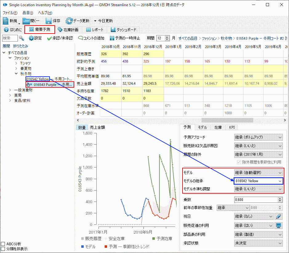 上記の図では、新しい品目の‘016543 Purple’の予測モデルは、品目‘016542 Yellow’の予測モデルを利用します。この方法は、非常に近似した季節パターンを持つ品目によく機能します。上記の例では、新しい品目の販売数量は適用元の半分のため、0.60となる乗数を設定します。