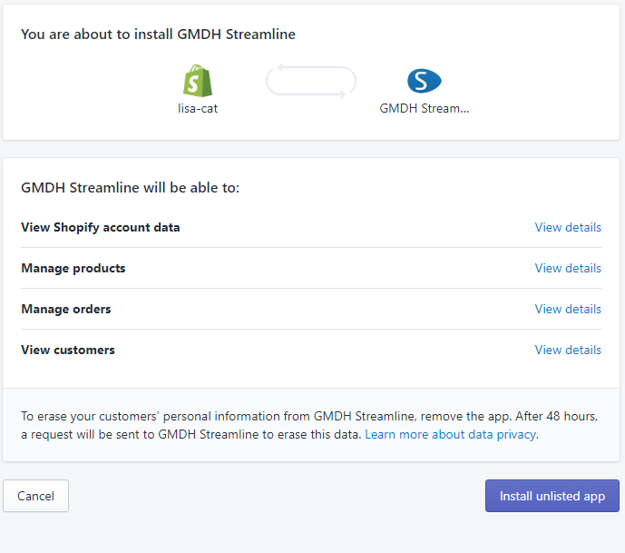 その後、GMDH Streamlineは、デフォルトブラウザでShopifyのログインページを開きます(下記の図を参照)。