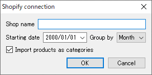 1. メニューのファイル > 新規 > Shopify 接続を選択します。Shopify 接続ダイアログが開きます。