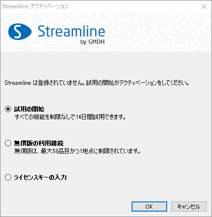 1. アクティベーション ウィンドウの無償版の利用継続オプションを選択し、OKをクリックします。