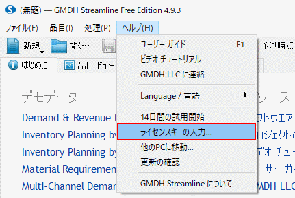 1. メニューよりヘルプ > ライセンスキーの入力を選択し、アクティベーション ウィンドウのライセンスキーの入力 オプションを選択します(下記の図を参照)。
