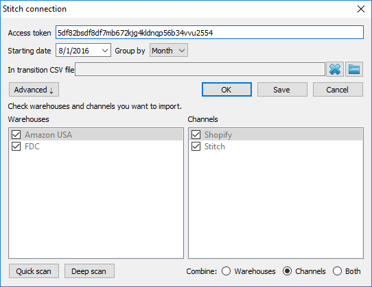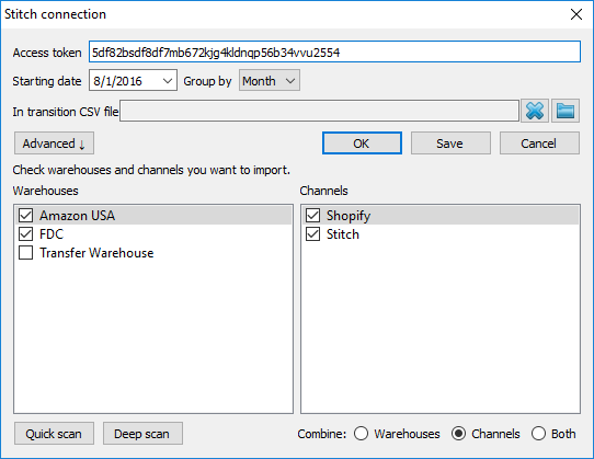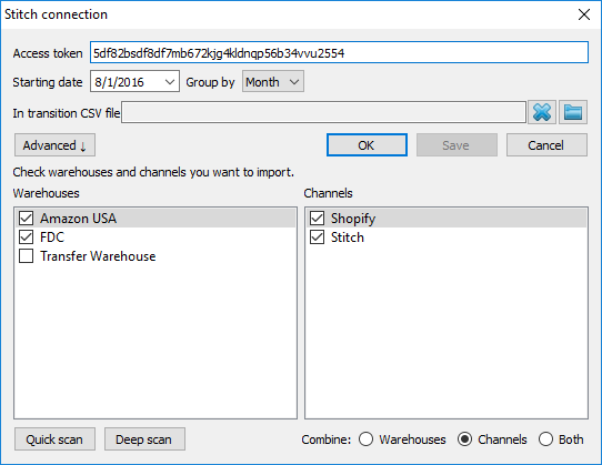 Stitch 接続ダイアログの高度ボタンは、ユーザーが一部の倉庫やチャネルを選んでインポートするための追加設定を表示します(下記の図を参照)。これらの設定は、チャネルのまとめや倉庫のまとめ、あるいは両方のまとめができます。
