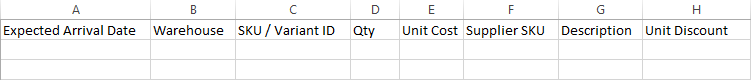 CSVファイルのフォーマットは、Stitch Xの購入オーダーインポートファイルのフォーマットに合わせます。列は次のようにします: