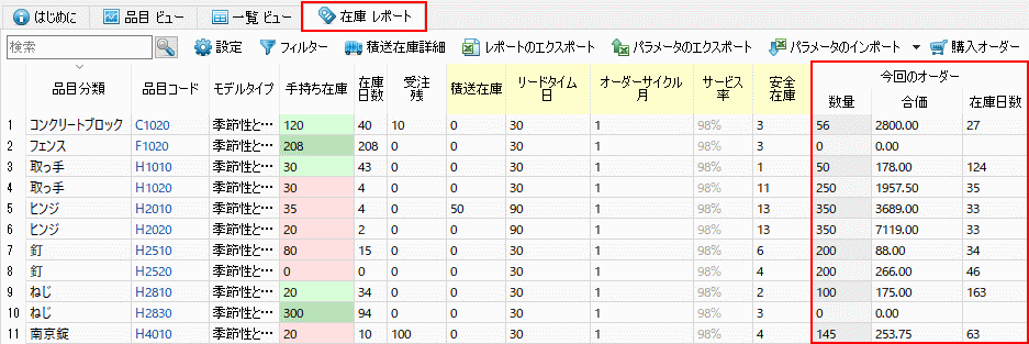 在庫計画タブの今回のオーダー列では、すべての品目の現在の推奨購入オーダーを表示します(下記の図を参照)。