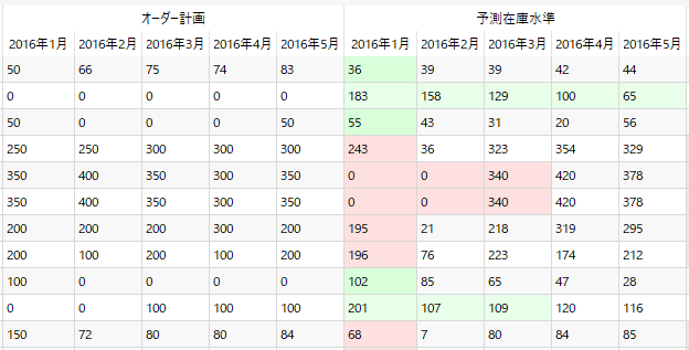 推奨オーダー数量は、各オーダーサイクルの先頭に表示されていることが確認できます。例えば、オーダーサイクルが2か月の品目H8010は、1月の初日までに200単位の購入オーダーの発行が必要です1)。