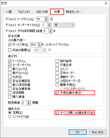 予測在庫水準の計算方法を詳しく学ぶには、オーダー計画計算文章を参照してください。