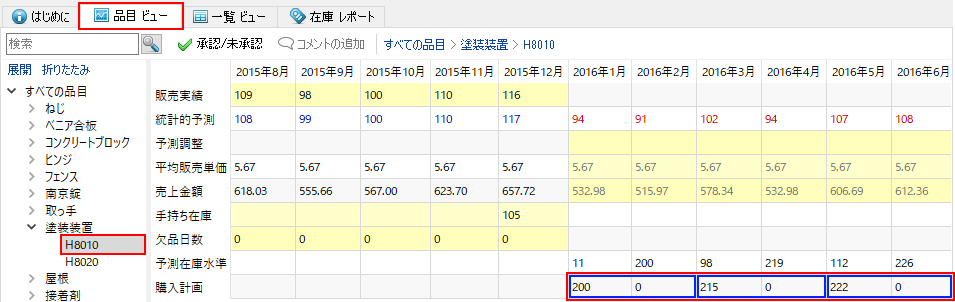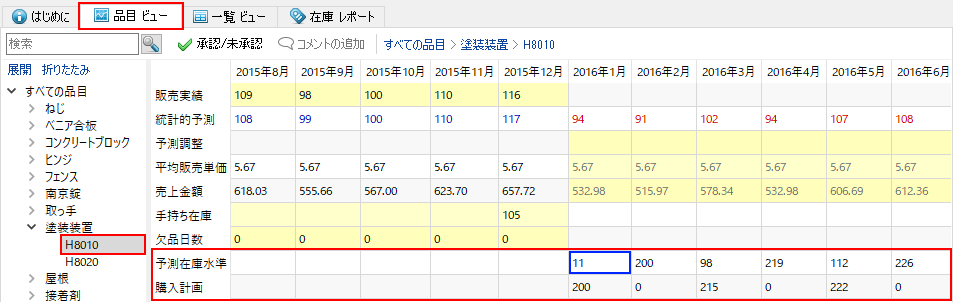 品目H8010を詳しく見てみます。この品目の予測在庫水準と購入計画は、テーブル内の予測在庫水準と購入計画の行に表示されます(下記の図を参照)。